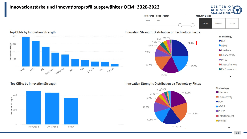 CAM identifys and analyzes the innovations of 30 global car manufacturers with about 100 brands in Europe, China, Korea, Japan and USA. Besides, the innovation activities of the TOP 100 automotive suppliers are analyzed on a regular basis.