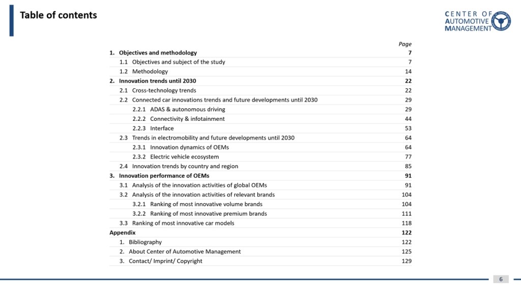 4) Innovation profiles of the most important manufacturers and rankings of the most innovative automotive groups, premium brands, volume brands as well as car models.