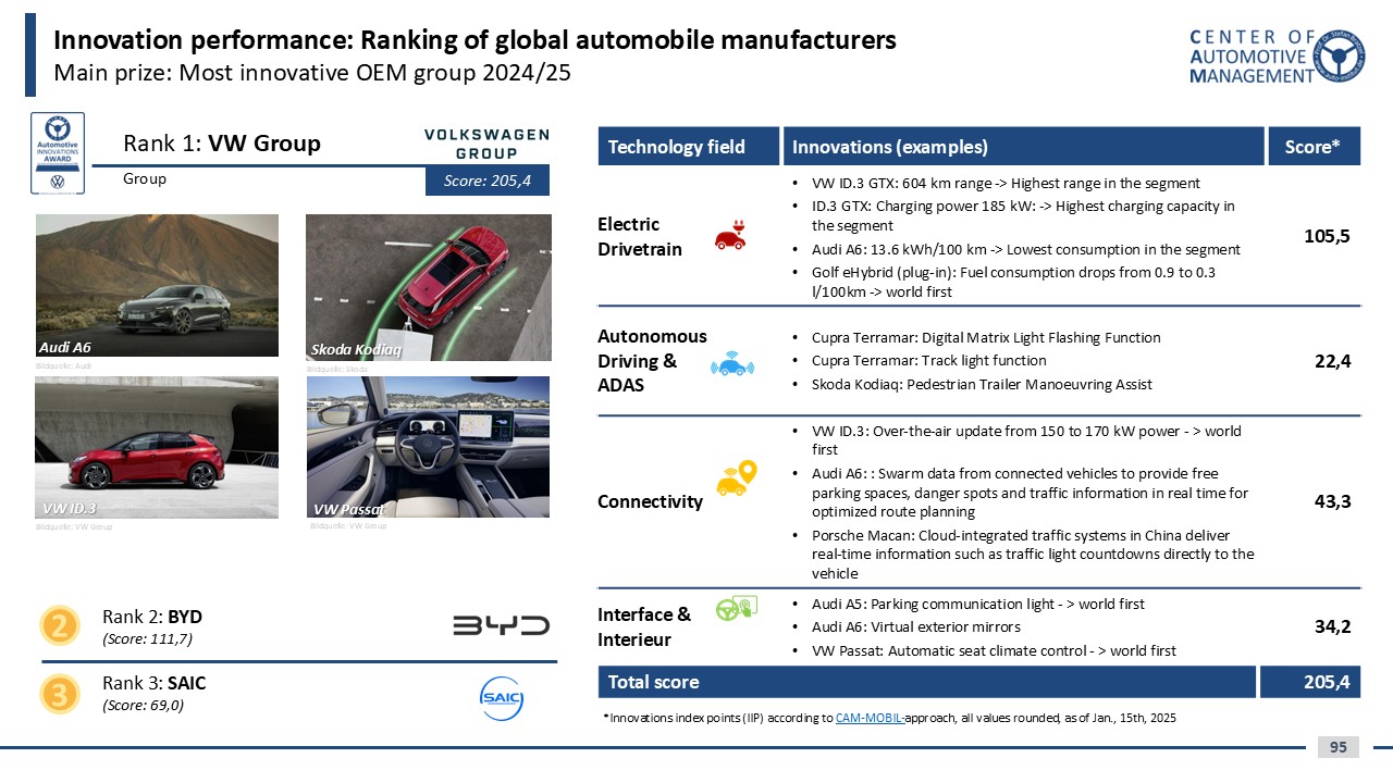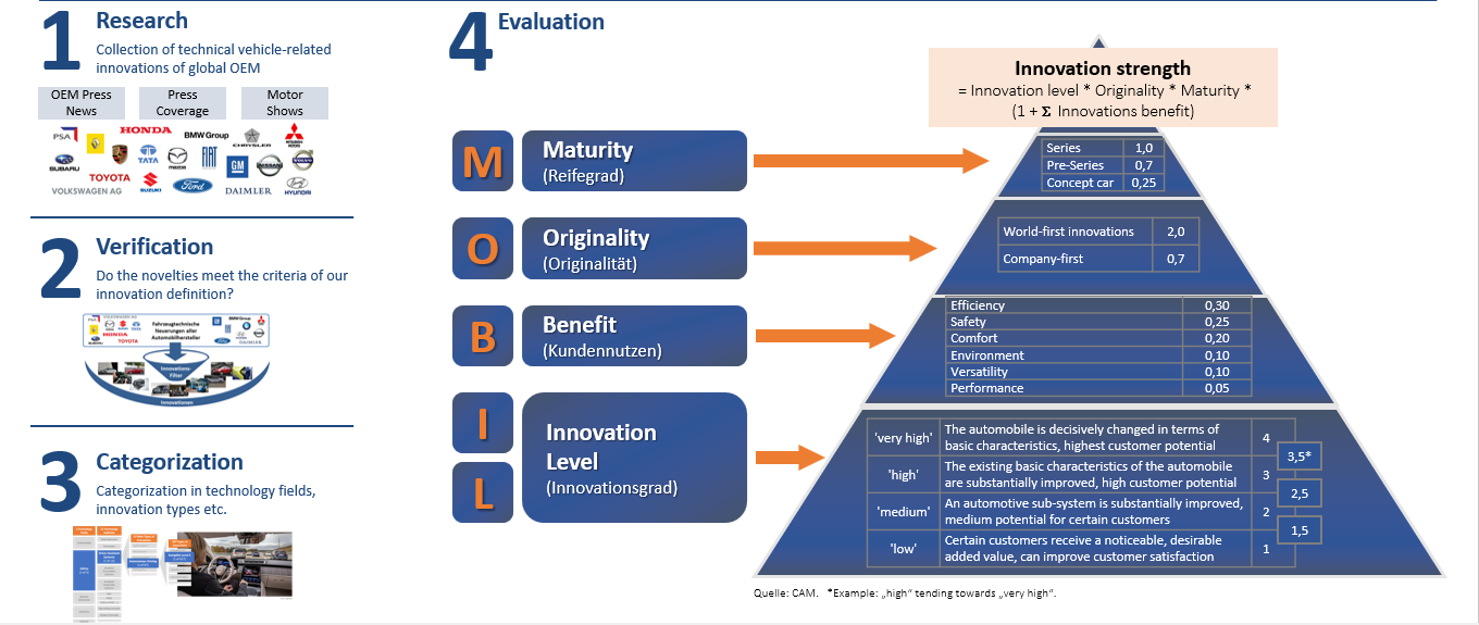 4) Innovation profiles of the most important manufacturers and rankings of the most innovative automotive groups, premium brands, volume brands as well as car models.