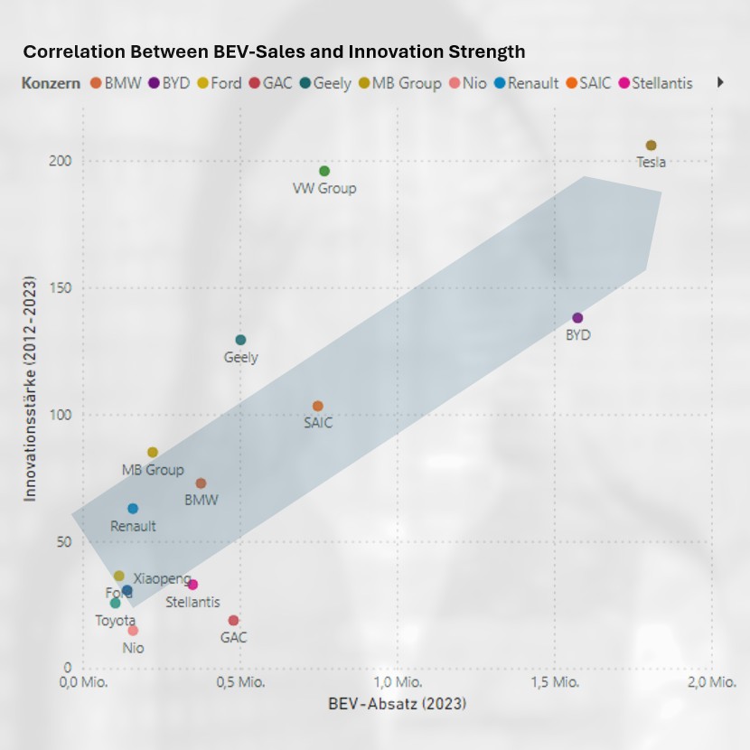 CAM offers connected databases for identification of interesting patterns: How are innovative strength and vehicle sales related? Which innovations from individual brands have high or low take rates?
